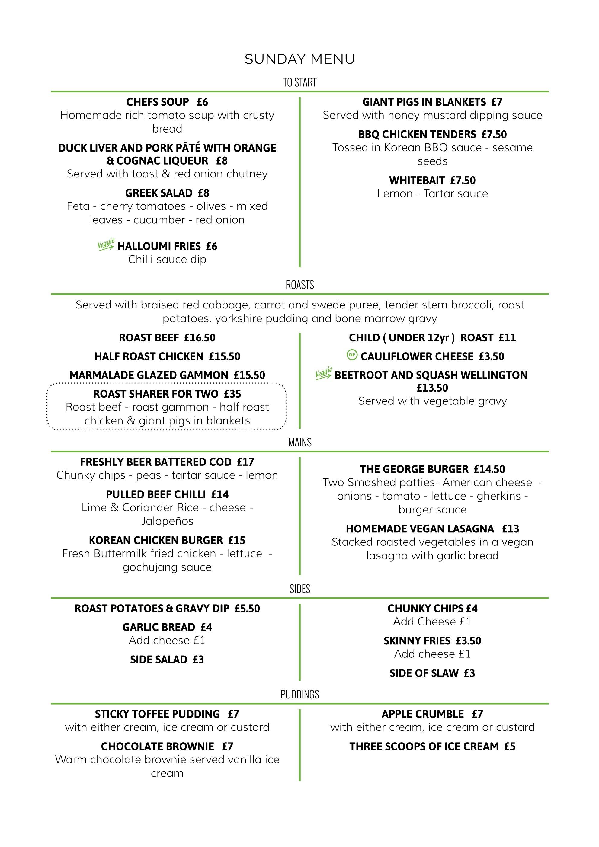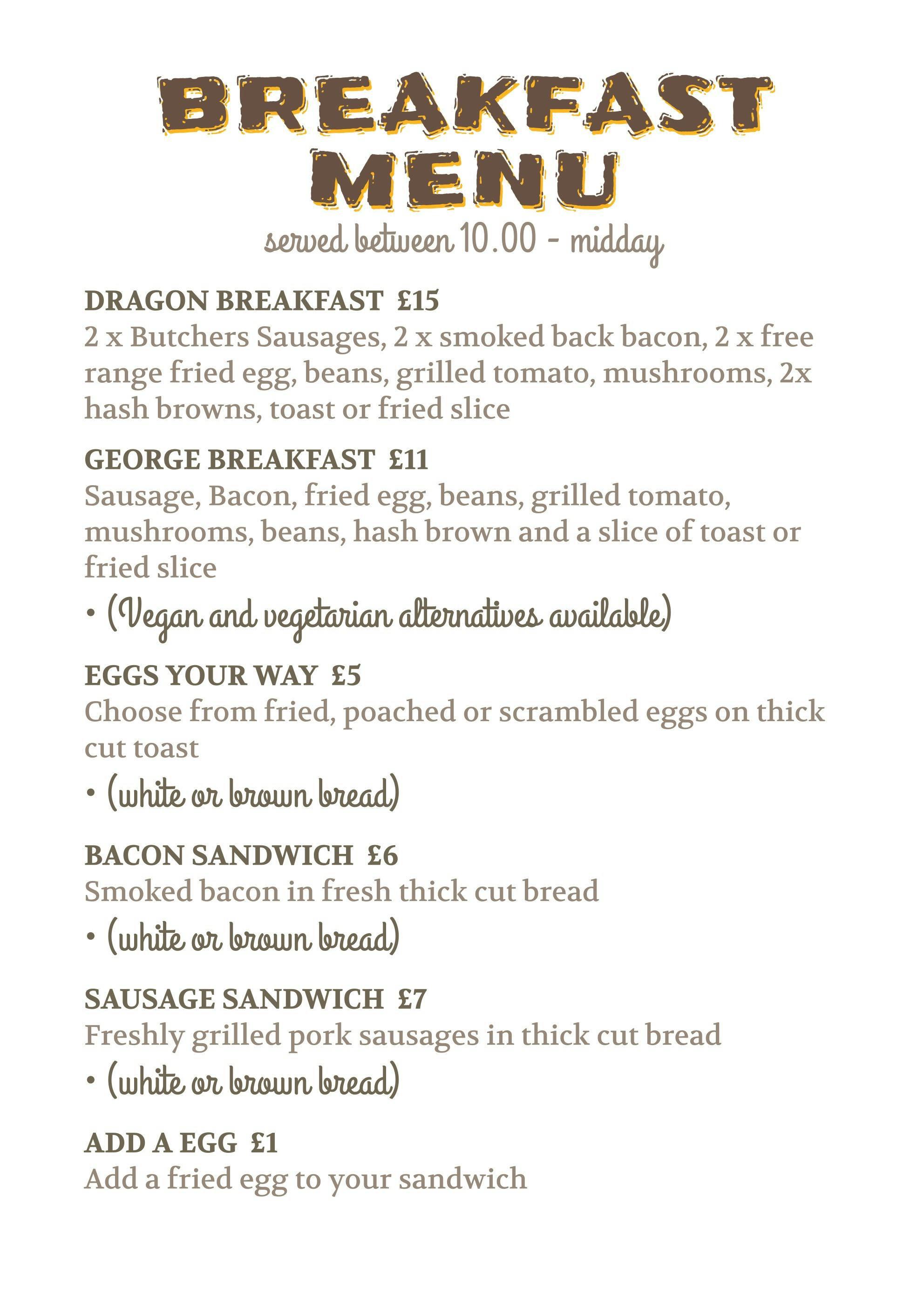 Here are our current menus for Monday to Saturday / Daily Breakfast / Sunday Lunch, please contact us or come in to see our Chef's special board that contains additional and seasonal dishes.